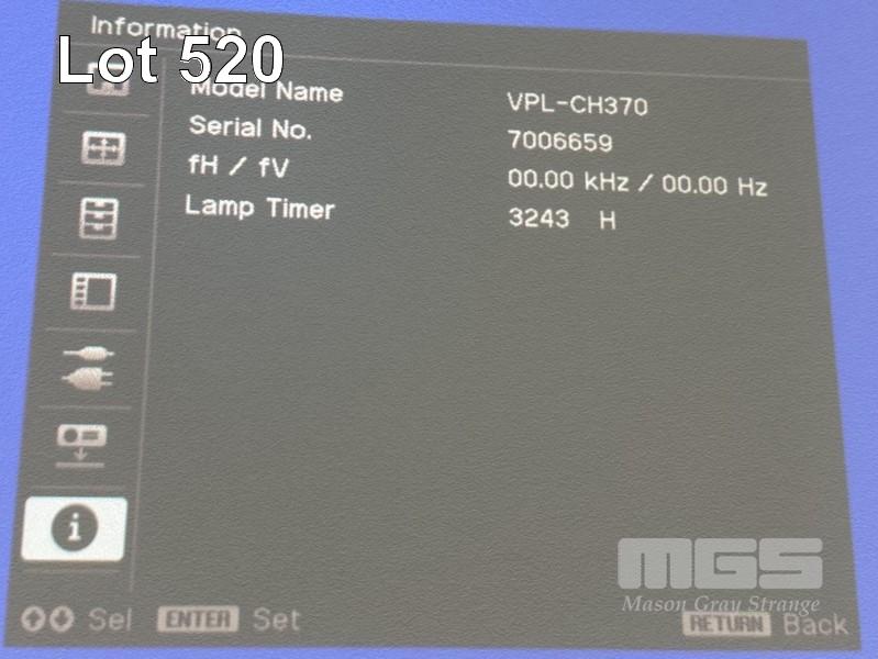 PROJECTOR, SONY VPL-CH370, 5,000 LUMENS, 3,243 HOURS SHOWING (NO REMOTE) (NOTE: MESSAGE "REPLACE THE LAMP AND CLEAN THE FILTER" S/N:7006659