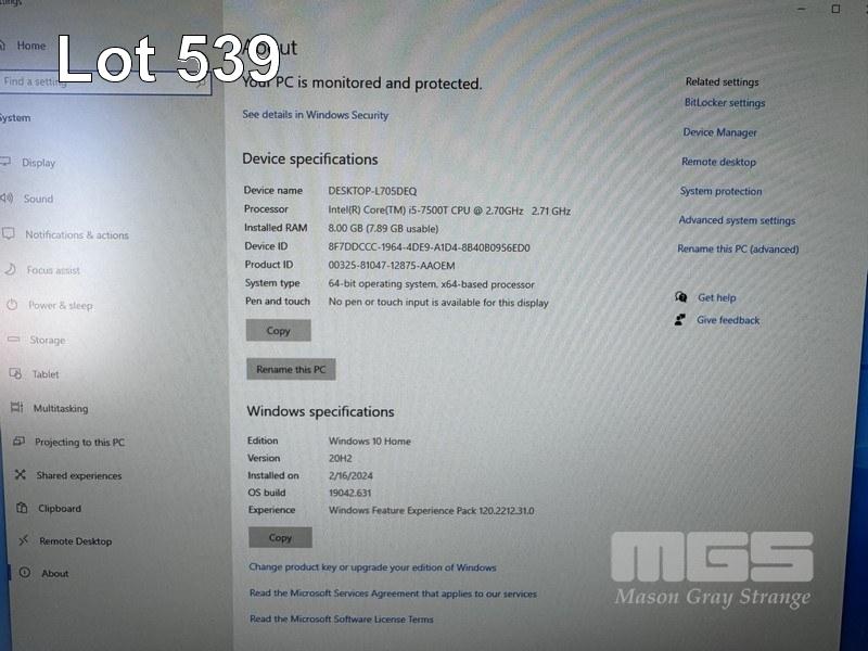 TINY-IN-ONE PC, LENOVO THINKCENTRE M710q, CORE i5 7500T (7TH GEN) @ 2.7GHz, 8GB DDR4 RAM, 256GB NVMe M.2 SSD, TIO24Gen3 23.8" LED-BL LCD WIDESCREEN, WEBCAM, Wi-Fi, WINDOWS 10 HOME INSTALLED & POWER SUPPLY (NO KEYBOARD, NO MOUSE) S/N:PC0SCU5W