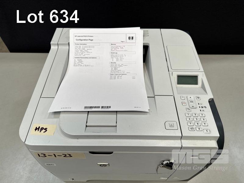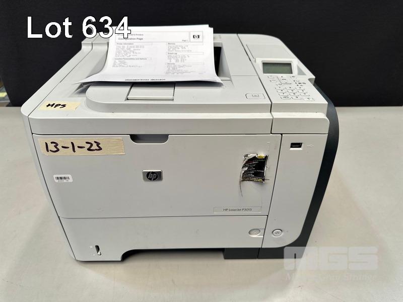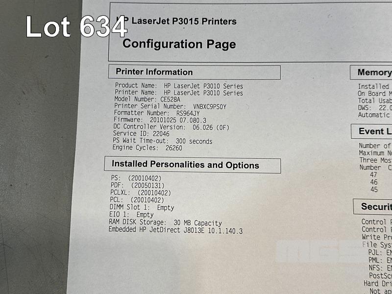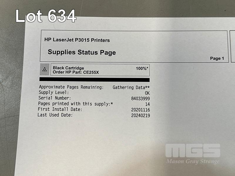 PRINTER, HP LASERJET P3015, 26,260 PAGES (TEST PAGE ATTACHED) S/N:VNBXC9PS0Y