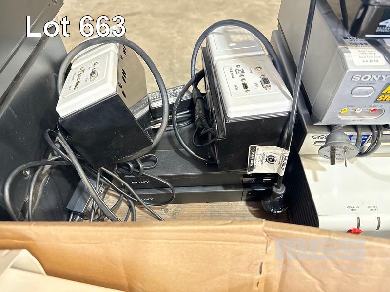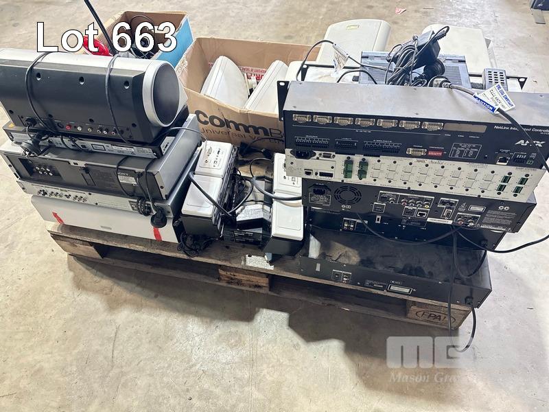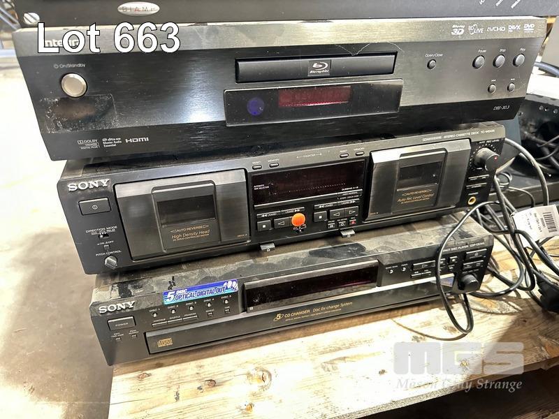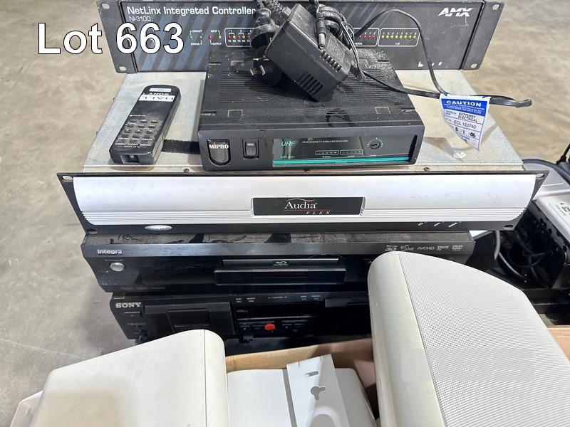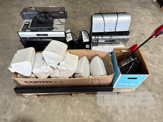 1 x PALLET LOT ASST AV INCLUDING AUSTRALIAN MONITOR SPEAKERS, BLU-RAY PLAYERS (NO REMOTES), TDK SPEAKER SYSTEM, SOUNDBAR, SONY CD CHANGER & CASSETTE DESK