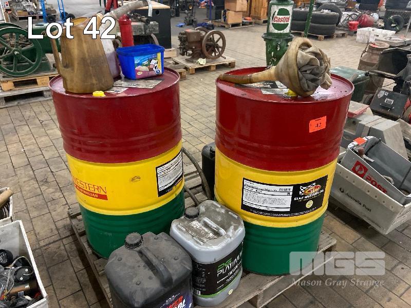 2 x 200 LITRE DRUMS & HAND PUMP, PART FULL, GULF WESTERN DIESEL &