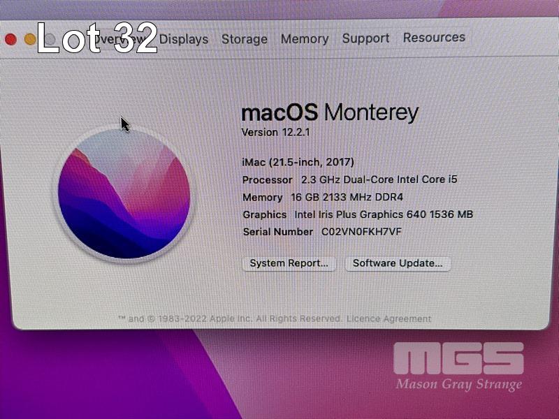 APPLE iMAC (A1418), CORE i5 7360U (7TH GEN) @ 2.3GHz, 16GB DDR4 RAM, 256GB SSD, BUILT-IN 21.5" RETINA DISPLAY (4096x2304), INTEL IRIS PLUS GRAPHICS 640, Wi-Fi, BLUETOOTH, MAC OS 12 INSTALLED (NO KEYBOARD, NO MOUSE) S/N:C02VN0FKH7VF
