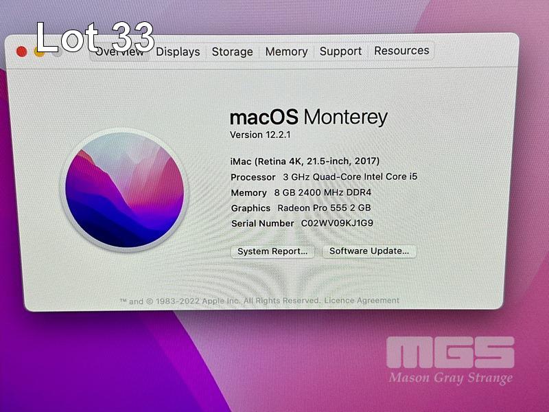 APPLE iMAC (A1418), CORE i5 7400 (7TH GEN) @ 3GHz, 8GB DDR4 RAM, 512GB SSD, BUILT-IN 21.5" RETINA DISPLAY (4096x2304), 2GB RADEON PRO 555 VIDEO, Wi-Fi, BLUETOOTH, MAC OS 12 INSTALLED (NO KEYBOARD, NO MOUSE) S/N:C02WV09KJ1G9