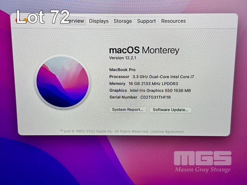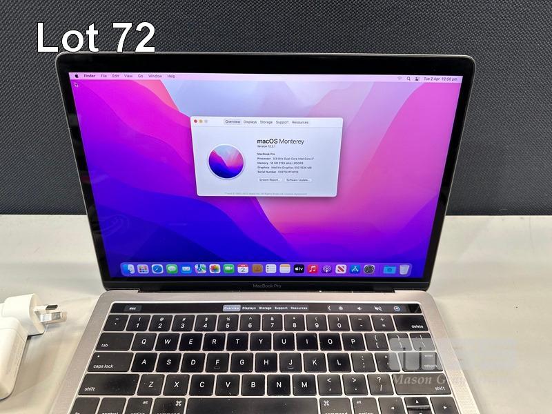 LAPTOP, APPLE MACBOOK PRO (A1706), CORE i7 6567U (6TH GEN) @ 3.3GHz, 16GB DDR3 RAM, 512GB SSD, 13.3" RETINA DISPLAY (2560x1600), INTEL IRIS GRAPHICS 550, THUNDERBOLT 3, TOUCHBAR, Wi-Fi, BLUETOOTH, MAC OS 12 INSTALLED & USB-C POWER SUPPLY (NOTE: MINOR MARKS ON SCREEN) S/N:C02TG31THF1R