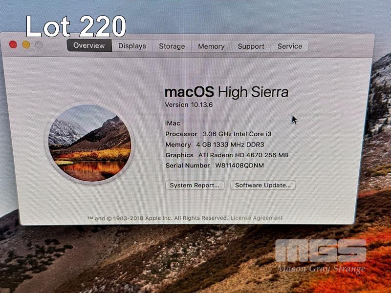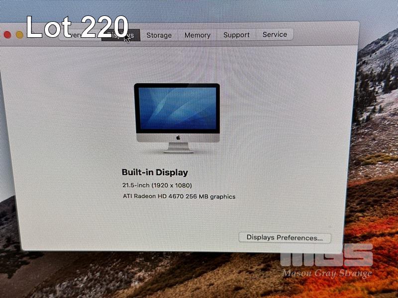APPLE iMAC (A1311), CORE i3 540 @ 3.06GHz, 4GB DDR3 RAM, 500GB SATA HDD, DVD-RW, BUILT-IN 21.5" DISPLAY (1920x1080), Wi-Fi, BLUETOOTH, MAC OS 10.13 INSTALLED (NO KEYBOARD, NO MOUSE) (NOTE: MINOR DAMAGE) S/N:W811408QDNM