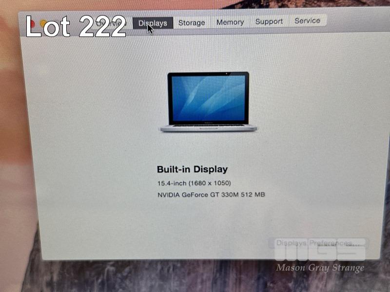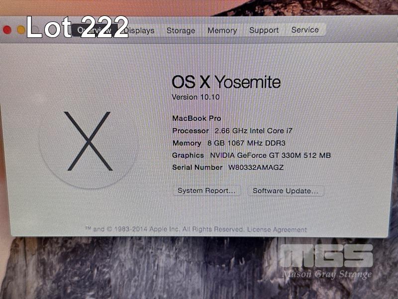 LAPTOP, APPLE MACBOOK PRO (A1286), CORE i7 620M @ 2.66GHz, 8GB DDR3 RAM, 500GB SATA HDD, DVD-RW, 15.4" WIDESCREEN (1680x1050), INTEL HD GRAPHICS, Wi-Fi, BLUETOOTH, MAC OS 10.10 INSTALLED & POWER SUPPLY (NOTE: DVD STUCK IN DVD DRIVE, HARDWARE FAULT) S/N:W80332AMAGZ