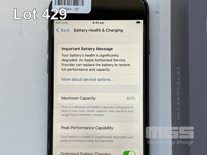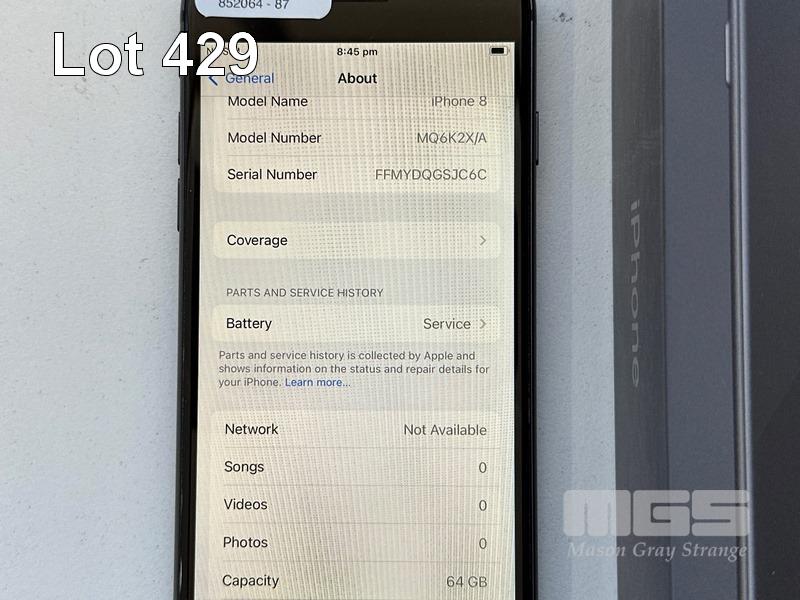 APPLE iPHONE 8, 64GB, SPACE GREY, MODEL MQ6K2X/A, BATTERY HEALTH 83% (NO CABLE, NO CHARGER) (NOTE: BATTERY SERVICE MESSAGE) S/N:FFMYDQGSJC6C