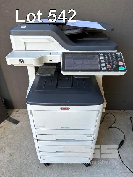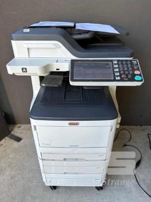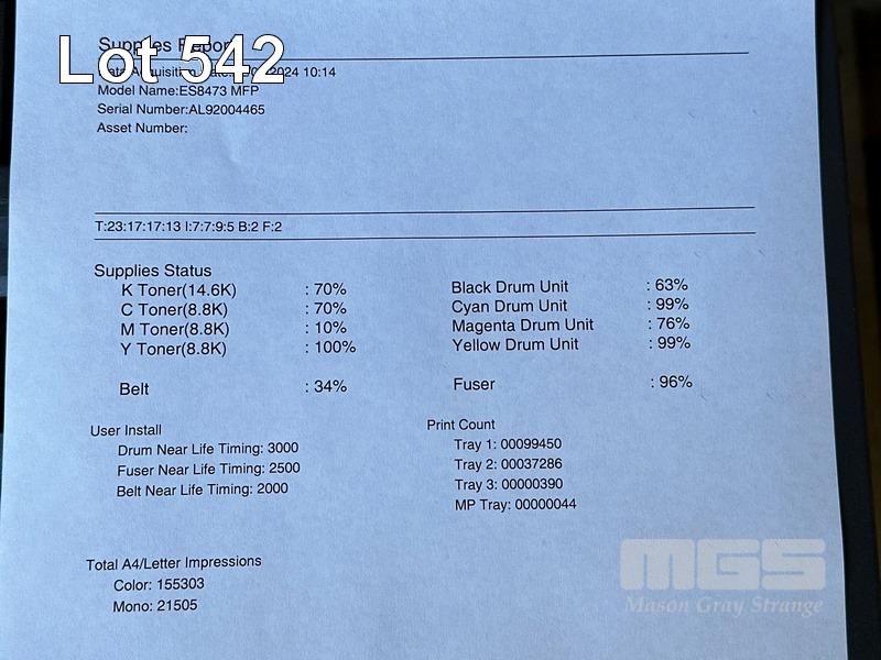 PRINTER, OKI EXECUTIVE SERIES ES8473 MFP COLOUR A3 MULTIFUNCTION LASER, ADF, USB, NETWORK, 155,303 COLOUR & 21,505 B&W PAGES (TEST PAGE ATTACHED) WITH 2ND/3RD TRAY ON CASTORS S/N:AL92004465
