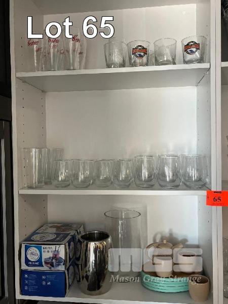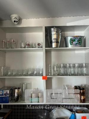 CORONA BUCKETS, "ICE", SHOT GLASSES, SHAKE GLASSES, VARIOUS MUGS & CUPS CONTENTS 2 x WALL MOUNT SHELVES