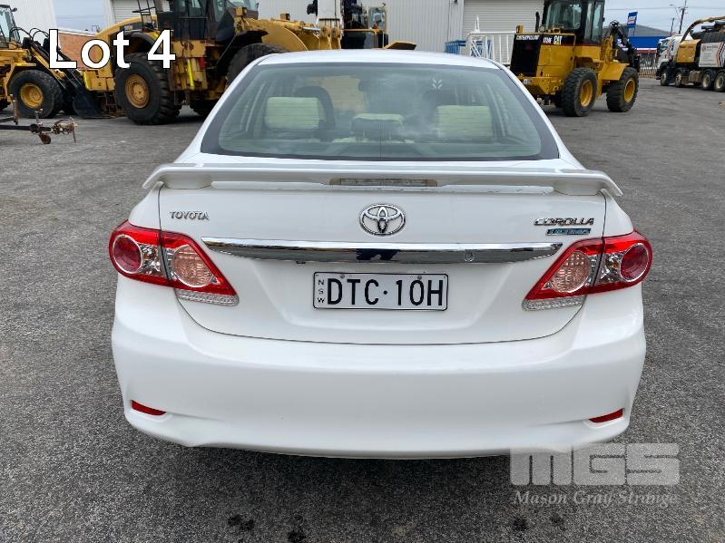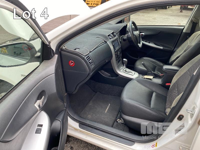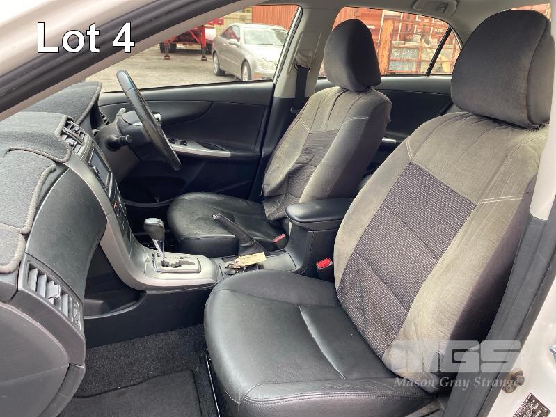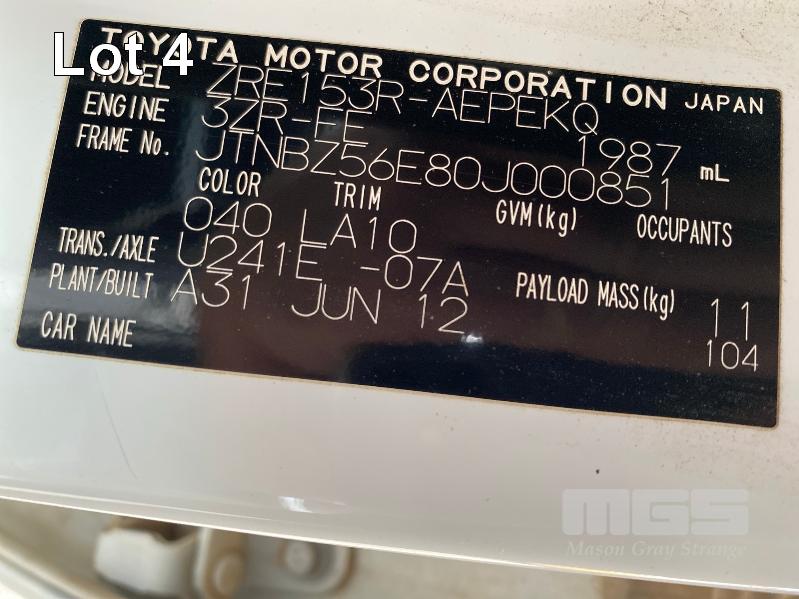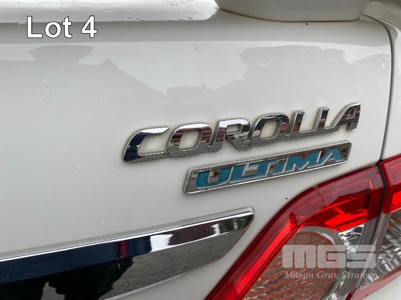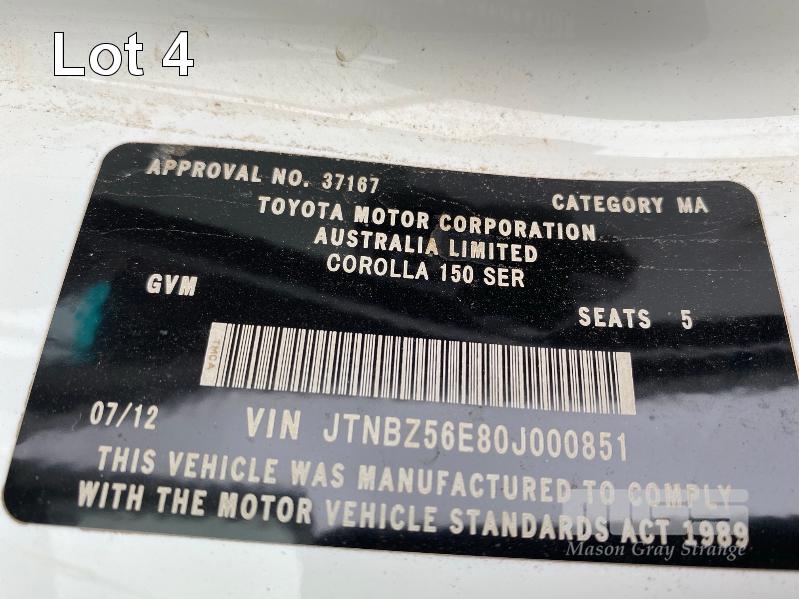 2012 TOYOTA COROLLA ULTIMA, 150 SERIES, SEDAN, FWD REG: NO PLATES VIN: JTNBZ56E80J000851 ENG: 3ZR-FE ODO: 122,565kms SHOWING 2.0ltr. VVTI, 4 CYL EFI, AUTO, WHITE, 4 DOORS, 5 SEAT, FWD AIR BAG, AIR CON, ALLOY WHEELS, CD PLAYER, CENTRAL LOCKING, CRUISE CONTROL, IMMOBILISER, POWER WINDOWS, TRACTION CONTROL, SUNROOF KEY #70 (NO PAPERS, WITH 1 KEY/S, WITH OWNER'S MANUAL, WITH SERVICE BOOKS) CONDITION: L\H\R DOOR - MINOR DENTS & SCRATCHES