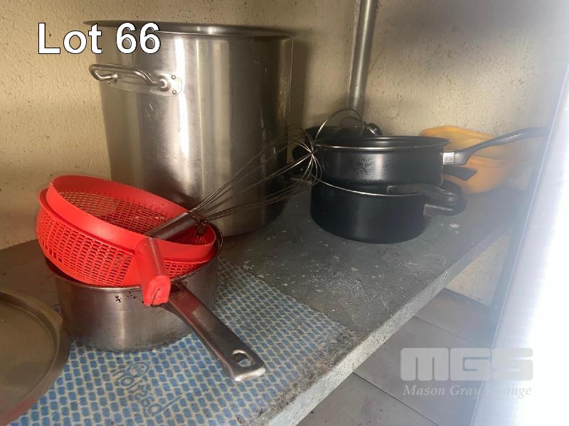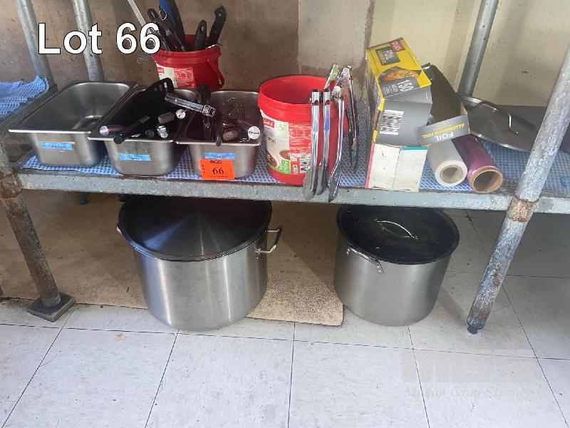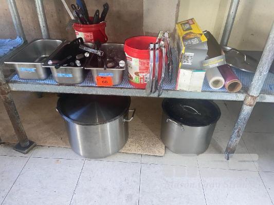 3 x STAINLESS STEEL STOCKPOTS, 10-15 LITRE, ASSORTED POTS, GASTRONORM TRAYS & KITCHEN UTENSILS