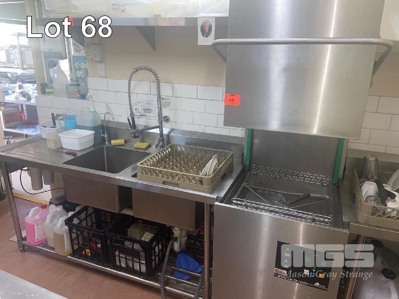 PASS THRU DISHWASHER, ECO 1000 415V WITH INFEED PRE WASH DEEP BOWL SINK,1800m (L), OVERHEAD FLEXIBLE PLATE WASH, OUTFEED BENCH, 600mm (L), 4 x TRAYS & DETERGENTS