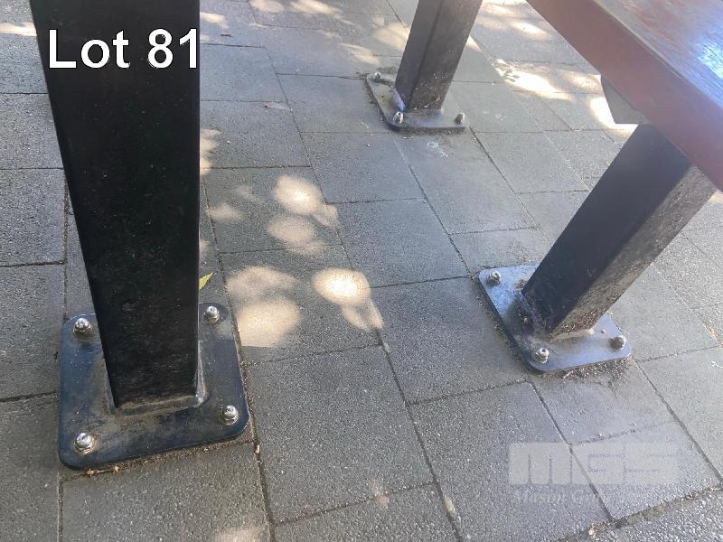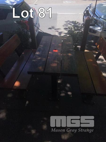 SOLID TIMBER OUTDOOR CAFE TABLES, 1200 x 600mm WITH 2 x BENCHES,SOLID STEEL DUAL PEDESTAL BASES, (EASY UNBOLT & REMOVE)