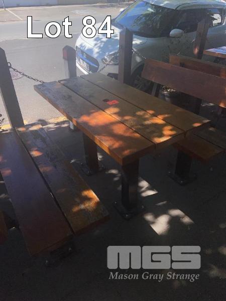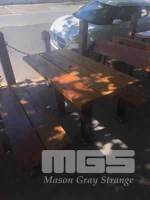 SOLID TIMBER OUTDOOR CAFE TABLES, 1200 x 600mm WITH 2 x BENCHES,SOLID STEEL DUAL PEDESTAL BASES, (EASY UNBOLT & REMOVE)