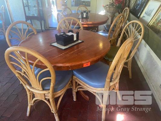 4 x TIMBER CAFE TABLES, 1000mm ROUND, CENTRE PEDESTAL & 5 x TIMBER CHAIRS