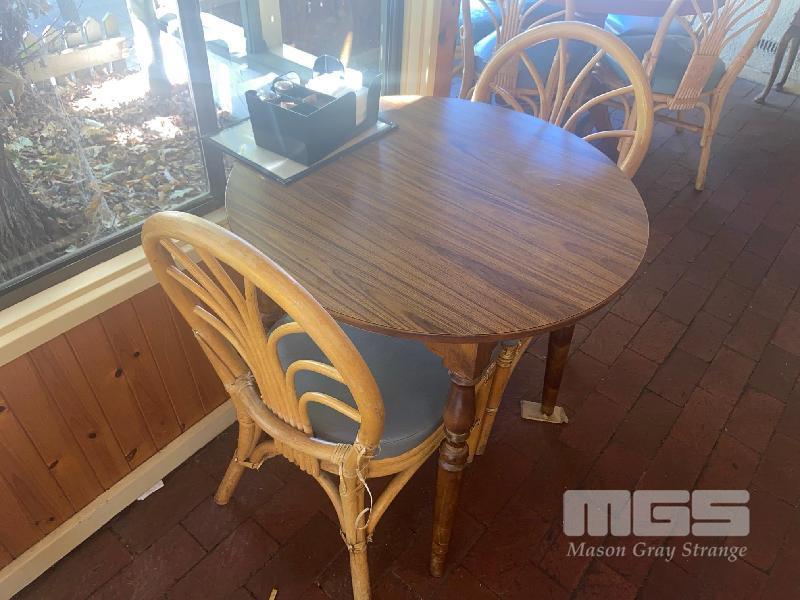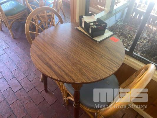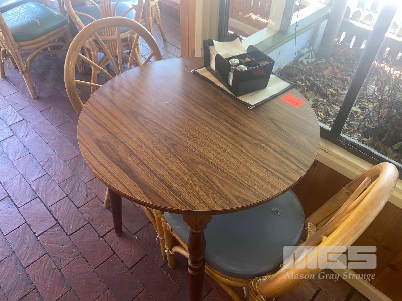 2 x ROUND TIMBER LAMINATE CAFE TABLE, 750mm, 4 LEG & 4 x TIMBER CHAIRS