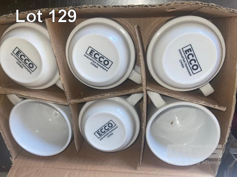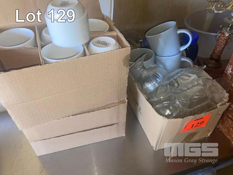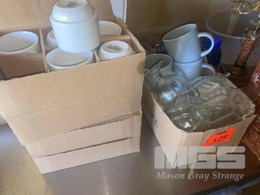 THE ASSORTED LOT INC GLASS DESSERT BOWLS, CUPS, 3 x CARTONS (600) NEW CUPS, ASSORTED CHINA & UTENSILS