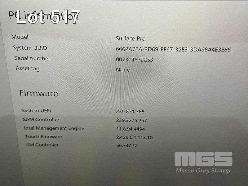 TABLET PC, MICROSOFT SURFACE PRO 5TH GEN, MODEL 1796, CORE m3-7Y30 (7TH GEN) @ 1GHz, 4GB RAM, 128GB SSD, 12.3" TOUCHSCREEN (2736x1824), INTEL HD GRAPHICS 615, Wi-Fi, BLUETOOTH, WINDOWS 10 PRO INSTALLED & KEYBOARD TYPE COVER (NO POWER SUPPLY) S/N:007314672253