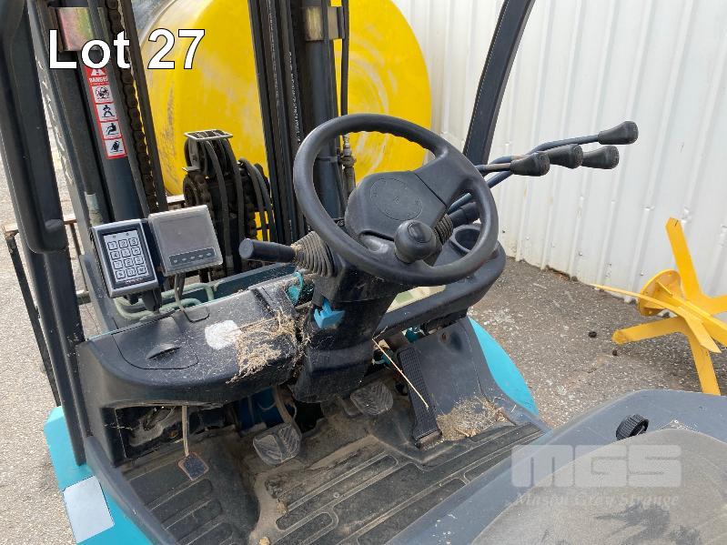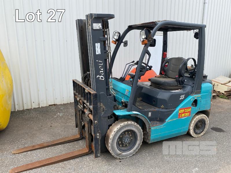 2014 KION BAOLI FORKLIFT, 2.5 TONNE MOD: CPQD25 S/NO: 1125/C0509 HOURS: 5,360 SHOWING 4 CYLINDER LPG ENGINE 3 STAGE CONTAINER MAST TYNE POSITIONING SOLID TYRES, KEYPAD SECURITY LOCK OUT RATED LIFT CAP : 1,970kg MAX LIFT HEIGHT: 4,500mm NOTE: ALL FAULTS, NOT STARTING, ELECTRICAL IGNITION FAULTS AND GAS LEAKAGES