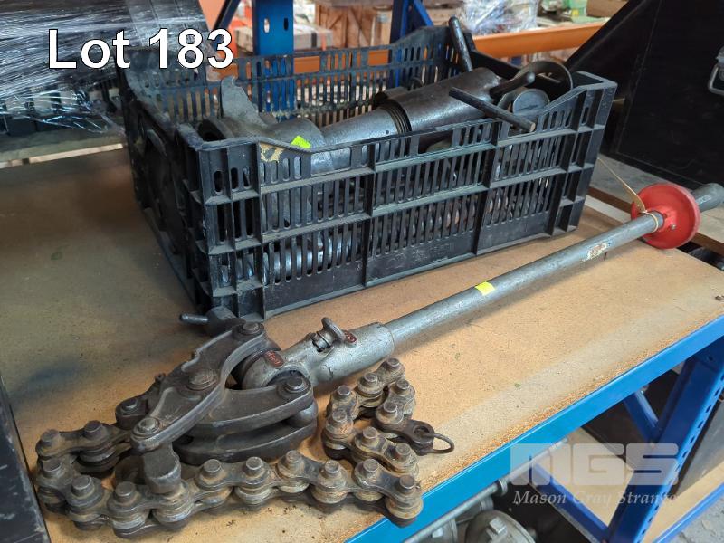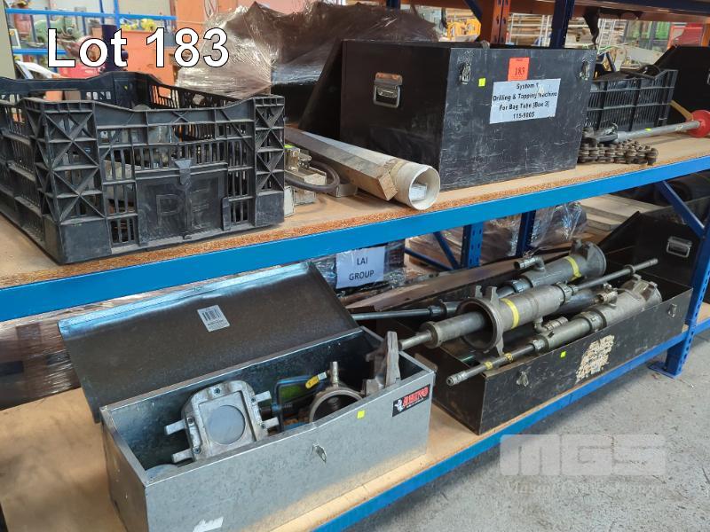 GAS MAIN PIPELINE TOOLS, ALH SYSTEMS LIMITED, BAG TUBE SYSTEM MOD: 115-9005 COMPRISING 4 x BAG TUBE ASSEMBLIES, DRILLING & TAPPING MACHINE, SADDLES, ETC RIGID PIPE CLAMP TOOL, PLUMB TEST GAUGES, ETC CONTENTS 3 x STEEL STORAGE CASES & 2 x PLASTIC TUBS 2 x SHELVES