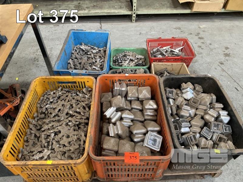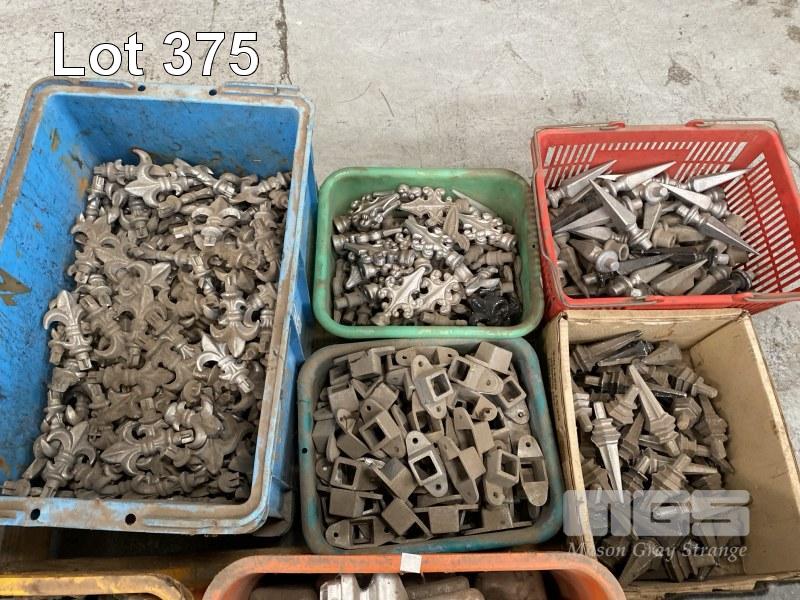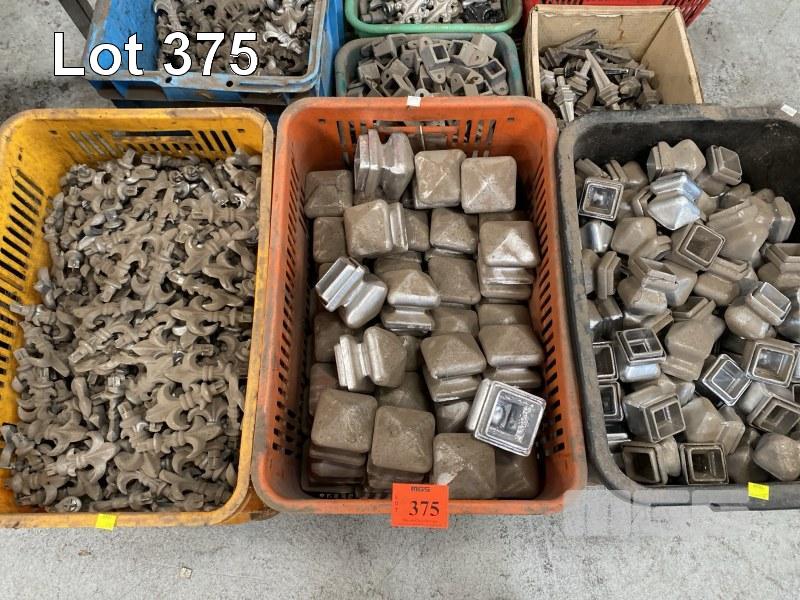 ASSORTED METAL FENCE CAPS, POST ENDS CAPS, DECORATIVE FENCE SPIKES, 8 x TUBS, 1 x PALLET