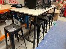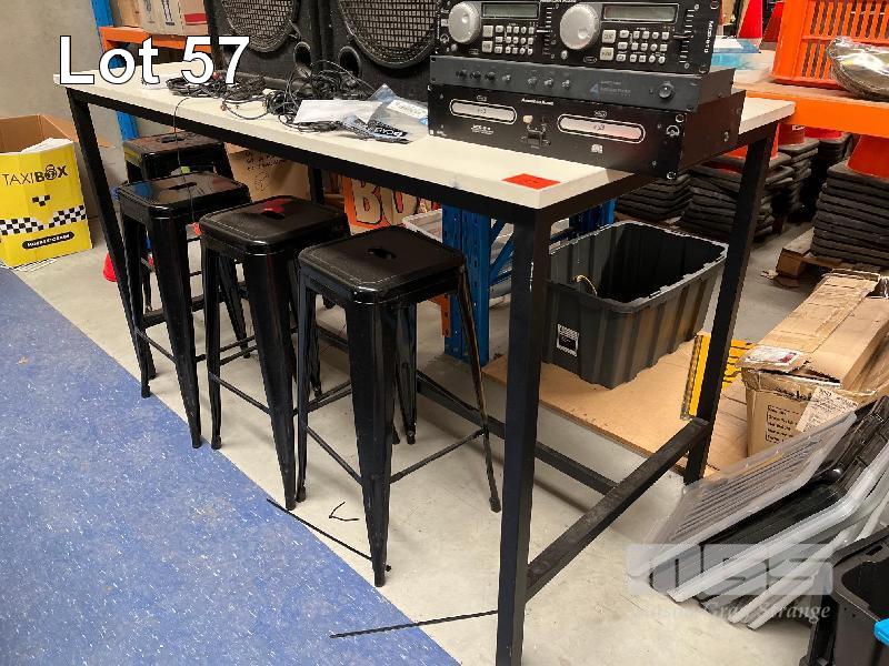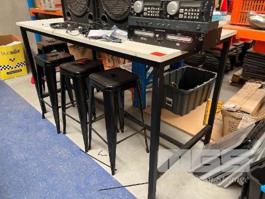 RECTANGULAR DRY BAR, TIMBER LAMINATE TOP, STEEL FRAME, 1800 x 900 x 960mm (H) WITH 4 x BLACK BAR STOOLS, STEEL