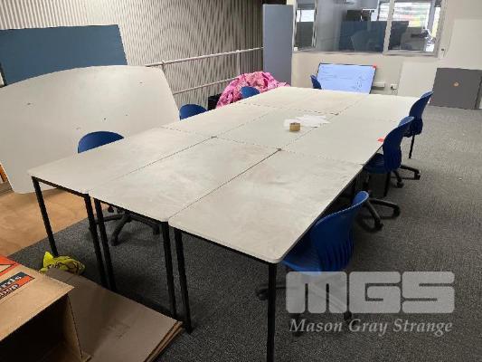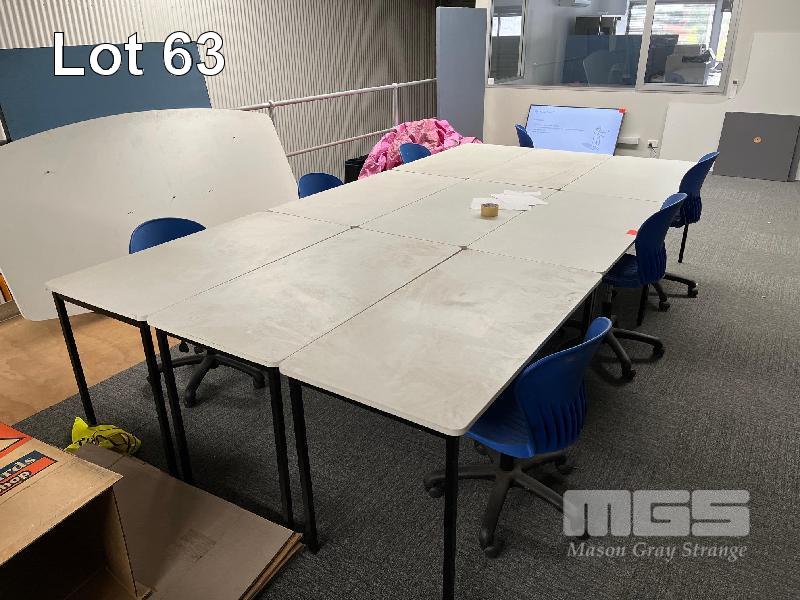 9 x TIMBER LAMINATE DESKS, STEEL FRAME, 1200 x 600mm, 7 x MATCHING BLUE GAS LIFT OFFICE CHAIRS
