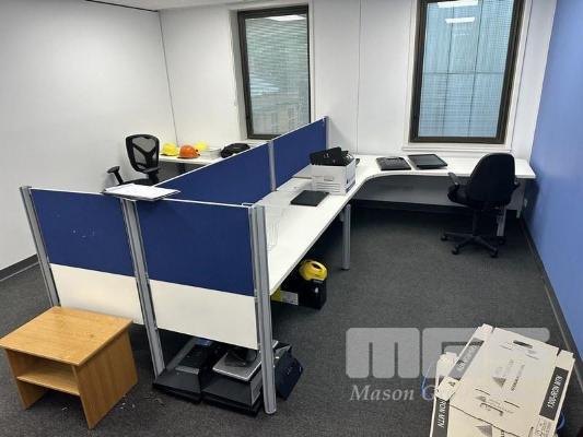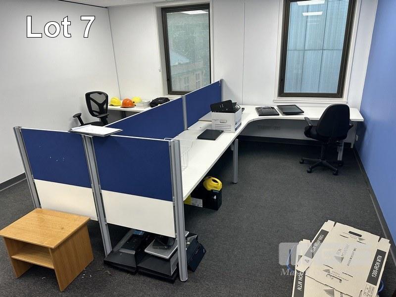 WORKSTATION SUIT 2 - 4 PERSON, WITH BLUE FABRIC DIVIDER, WHITE LAMINATE