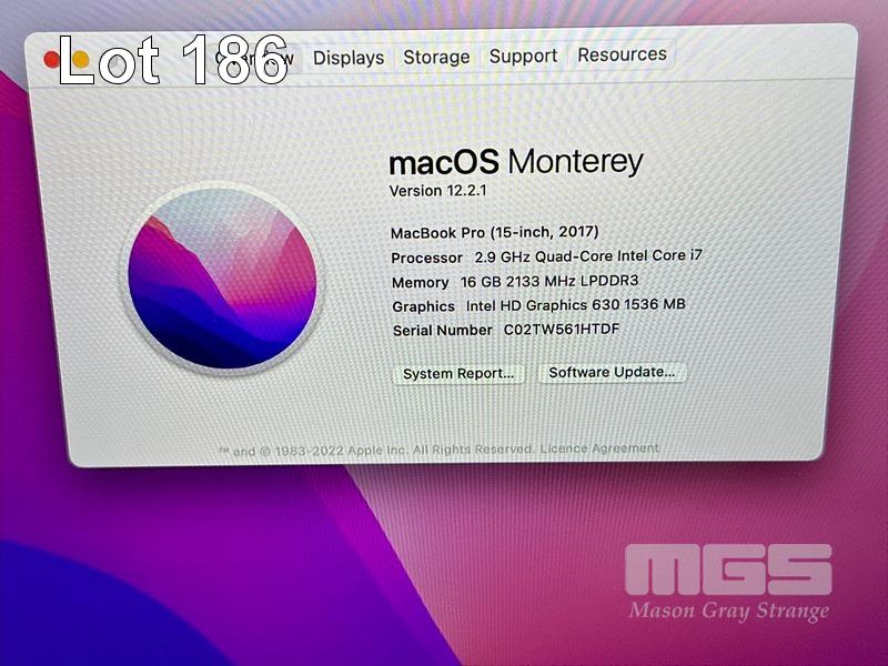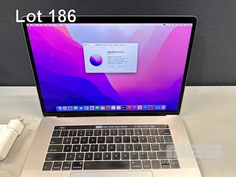 LAPTOP, APPLE MACBOOK PRO (A1707), CORE i7 7820HQ (7TH GEN) @ 2.9GHz, 16GB DDR3 RAM, 1TB SSD, 15.4" RETINA DISPLAY (2880x1800), INTEL HD GRAPHICS 630, Wi-Fi, BLUETOOTH, MAC OS 12 INSTALLED & USB-C POWER SUPPLY (NOTE: BATTERY SERVICE RECOMMENDED MESSAGE, MARKS ON SCREEN) S/N:C02TW561HTDF