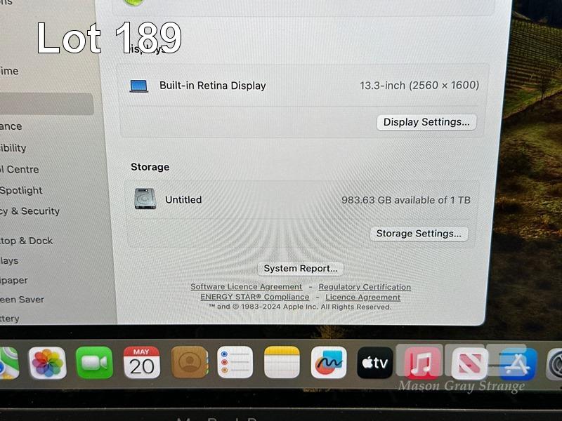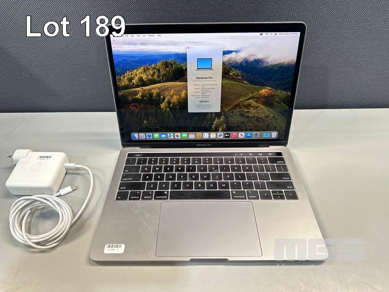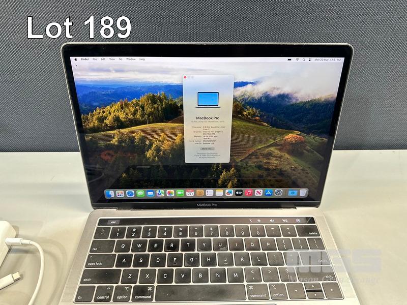 LAPTOP, APPLE MACBOOK PRO (A1989), CORE i7 8569U (8TH GEN) @ 2.8GHz, 16GB DDR3 RAM, 1TB SSD, 13.3" RETINA DISPLAY (2560x1600), INTEL IRIS PLUS GRAPHICS 655, Wi-Fi, BLUETOOTH, MAC OS 14 INSTALLED & USB-C POWER SUPPLY (NOTE: MARKS ON SCREEN) S/N:C02Z115YLVDL