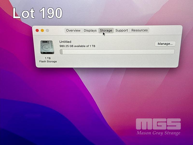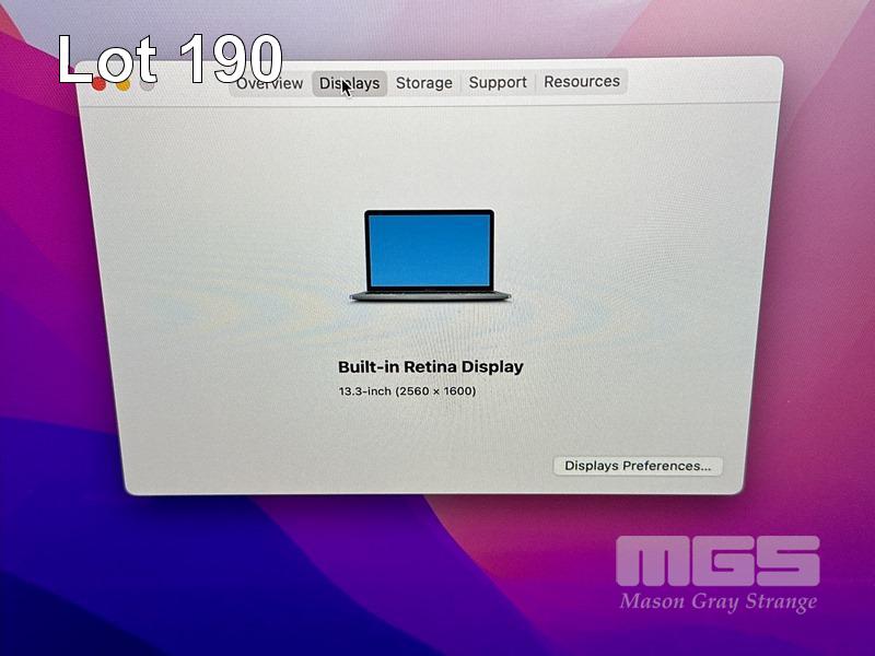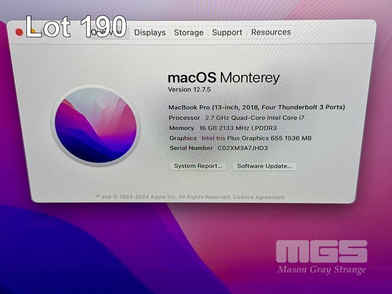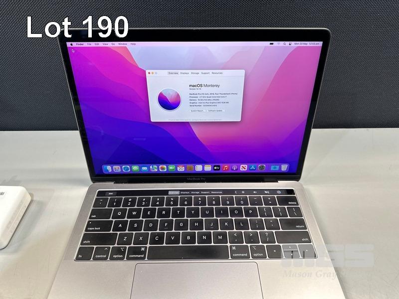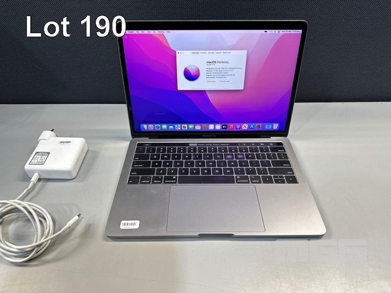 LAPTOP, APPLE MACBOOK PRO (A1989), CORE i7 8559U (8TH GEN) @ 2.7GHz, 16GB DDR3 RAM, 1TB SSD, 13.3" RETINA DISPLAY (2560x1600), INTEL IRIS PLUS GRAPHICS 655, Wi-Fi, BLUETOOTH, MAC OS 12 INSTALLED & USB-C POWER SUPPLY (NOTE: MARKS ON SCREEN) S/N:C02XM3A7JHD3