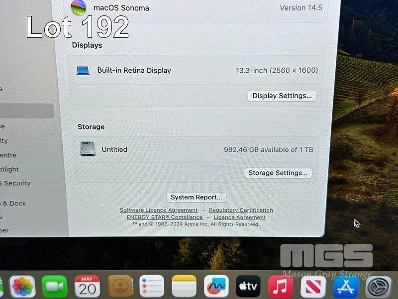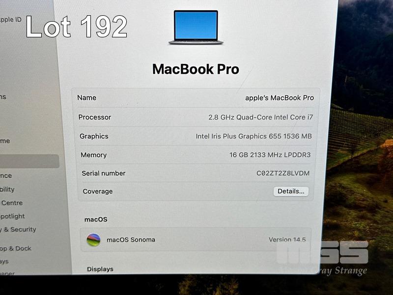 LAPTOP, APPLE MACBOOK PRO (A1989), CORE i7 8569U (8TH GEN) @ 2.8GHz, 16GB DDR3 RAM, 1TB SSD, 13.3" RETINA DISPLAY (2560x1600), INTEL IRIS PLUS GRAPHICS 655, Wi-Fi, BLUETOOTH, MAC OS 14 INSTALLED & USB-C POWER SUPPLY (NOTE: MARKS & SCRATCHES ON SCREEN) S/N:C02ZT2Z8LVDM
