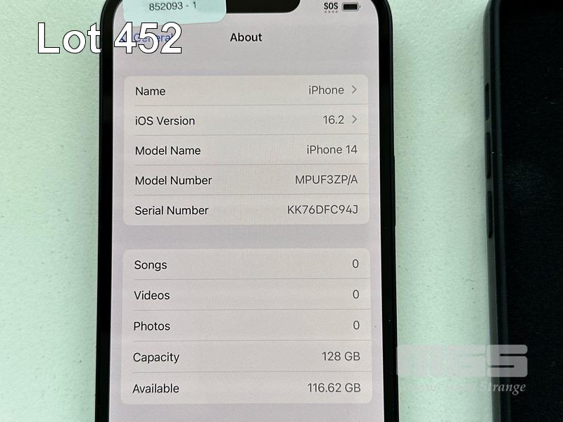 APPLE iPHONE 14, 128GB, MIDNIGHT, MODEL MPUF3ZP/A, BATTERY HEALTH 100% (NO CABLE, NO CHARGER) S/N:KK76DFC94J