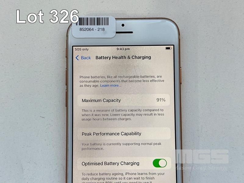 APPLE iPHONE 8, 256GB, GOLD, MODEL MQ7H2X/A, BATTERY HEALTH 91% (NO CABLE, NO CHARGER) S/N:C7CVHQJPJC6Q