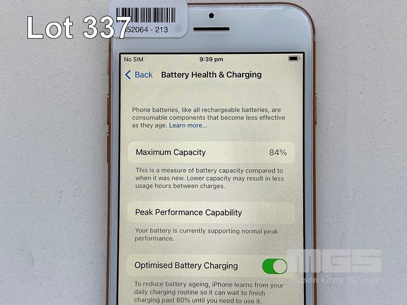 APPLE iPHONE 8, 256GB, GOLD, MODEL MQ7H2X/A, BATTERY HEALTH 84% (NO CABLE, NO CHARGER) S/N:C7CVHPH4JC6Q