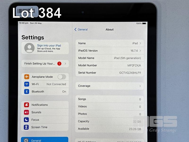 APPLE iPAD 5TH GEN, 32GB, Wi-Fi, SPACE GREY, MODEL MP2F2X/A, A1822 (NO CABLE, NO CHARGER) S/N:GCTVQJX8HLF9