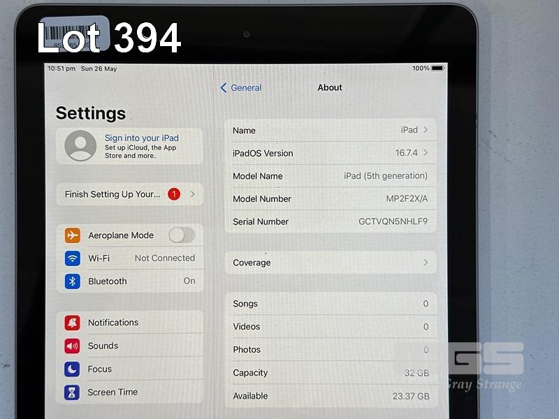 APPLE iPAD 5TH GEN, 32GB, Wi-Fi, SPACE GREY, MODEL MP2F2X/A, A1822 (NO CABLE, NO CHARGER) S/N:GCTVQN5NHLF9