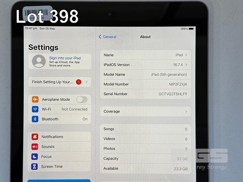 APPLE iPAD 5TH GEN, 32GB, Wi-Fi, SPACE GREY, MODEL MP2F2X/A, A1822 (NO CABLE, NO CHARGER) S/N:GCTVQJT5HLF9