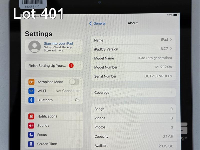 APPLE iPAD 5TH GEN, 32GB, Wi-Fi, SPACE GREY, MODEL MP2F2X/A, A1822 (NO CABLE, NO CHARGER) S/N:GCTVQXNRHLF9