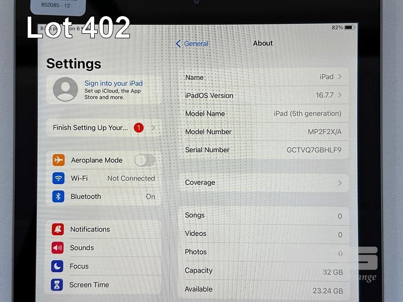 APPLE iPAD 5TH GEN, 32GB, Wi-Fi, SPACE GREY, MODEL MP2F2X/A, A1822 (NO CABLE, NO CHARGER) S/N:GCTVQ7GBHLF9