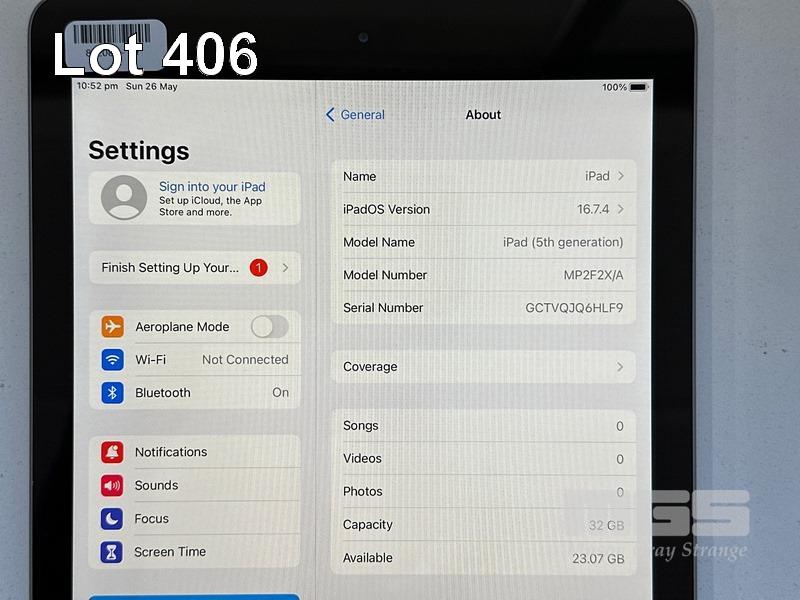APPLE iPAD 5TH GEN, 32GB, Wi-Fi, SPACE GREY, MODEL MP2F2X/A, A1822 (NO CABLE, NO CHARGER) S/N:GCTVQJQ6HLF9