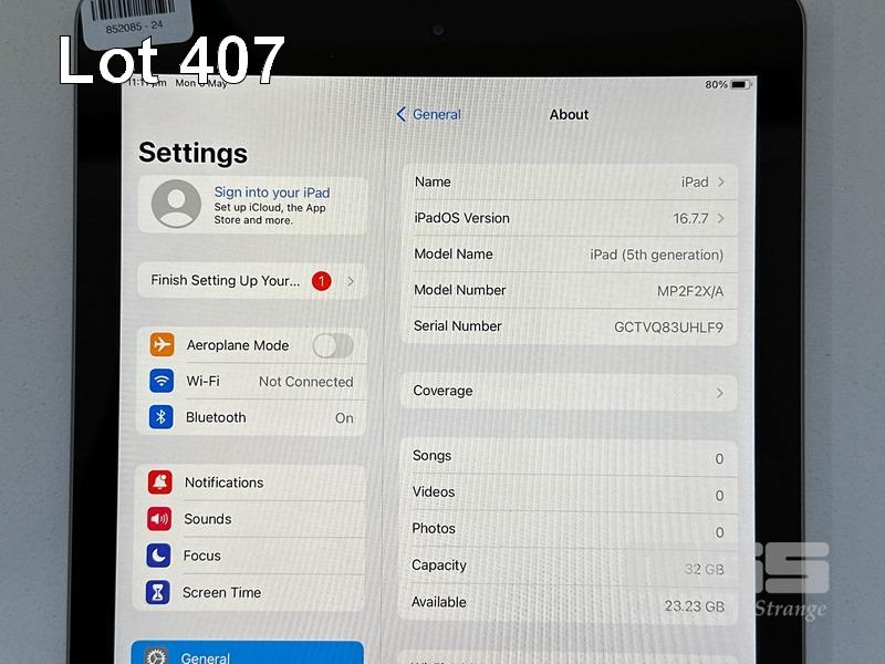 APPLE iPAD 5TH GEN, 32GB, Wi-Fi, SPACE GREY, MODEL MP2F2X/A, A1822 (NO CABLE, NO CHARGER) S/N:GCTVQ83UHLF9