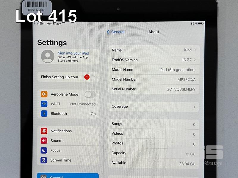 APPLE iPAD 5TH GEN, 32GB, Wi-Fi, SPACE GREY, MODEL MP2F2X/A, A1822 (NO CABLE, NO CHARGER) S/N:GCTVQ83LHLF9