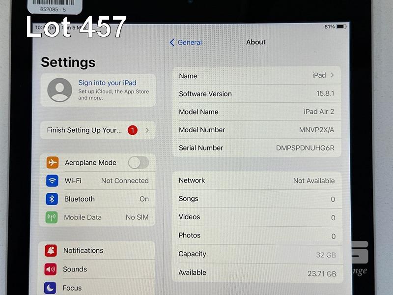 APPLE iPAD AIR 2, 32GB, Wi-Fi, CELLULAR, SPACE GREY, MODEL MNVP2X/A, A1567 (NO CABLE, NO CHARGER) S/N:DMPSPDNUHG6R