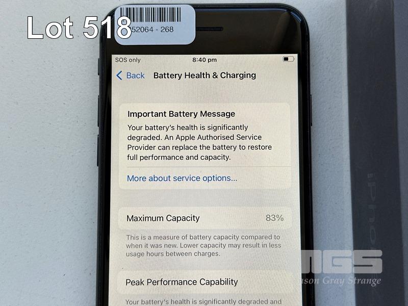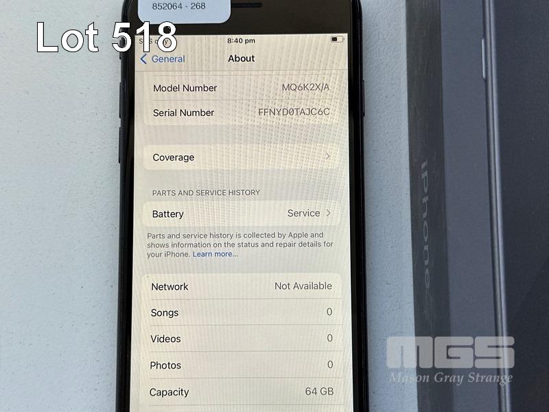 APPLE iPHONE 8, 64GB, SPACE GREY, MODEL MQ6K2X/A, BATTERY HEALTH 83% (NO CABLE, NO CHARGER) (NOTE: BATTERY SERVICE MESSAGE) S/N:FFNYD0TAJC6C