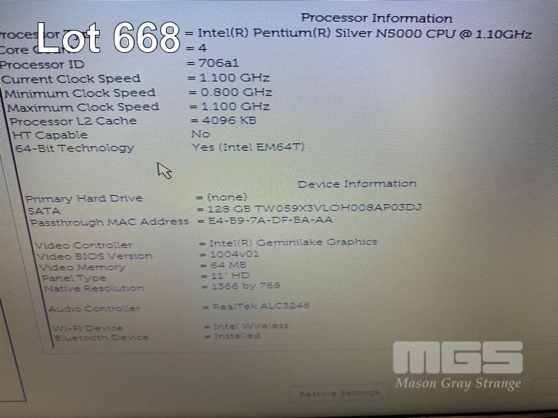 LAPTOP, DELL LATITUDE 3190, PENTIUM SILVER N5000 @ 1.1GHz, 4GB DDR4 RAM, 128GB M.2 SSD, 11.6" WIDESCREEN (1366x768), INTEL UHD GRAPHICS 605, Wi-Fi, BLUETOOTH, WINDOWS 11 PRO EDUCATION INSTALLED & POWER SUPPLY S/N:CMH76S2