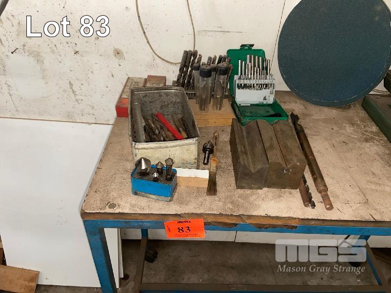 2 x V-BLOCKS, ASSORTED STRAIGHT SHANK DRILLS, DEBURRING HEADS & 2 x RECOIL UNITS