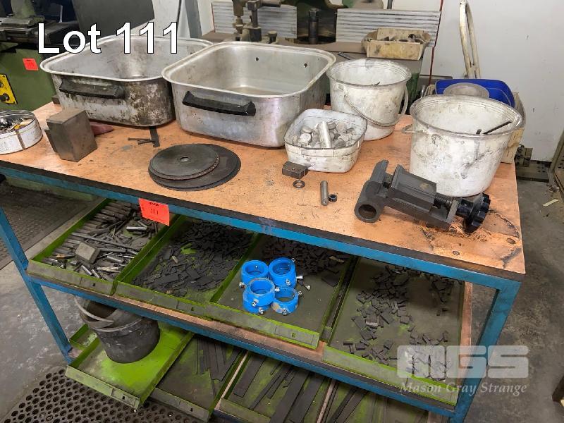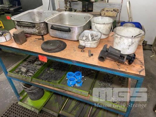 2 x ALLOY WASH TRAYS, ASSORTED TOOLING, MACHINE CLAMP, PIPE COLLARS CONTENTS RACKS