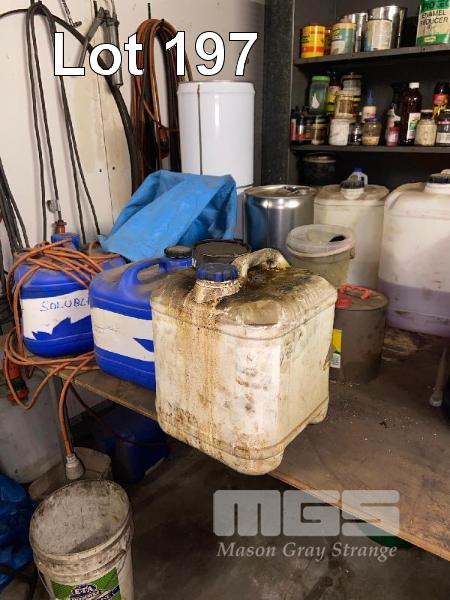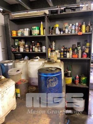 LARGE QUANTITY SOLVENTS,GUN WASH , OILS, AEROSOL SPRAYS, CONTENTS OF TABLE & 2 x SHELF UNITS, INCLUDES SHELVES & TABLE