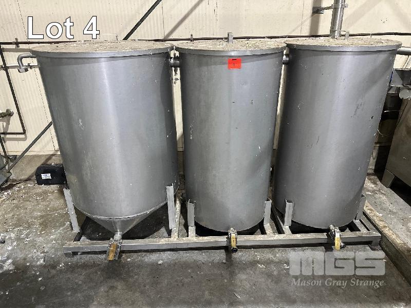 3 x FLOTATION TANKS, STAINLESS STEEL EACH 400 LITRE APPROX WITH VALVES ON SKID BAASE